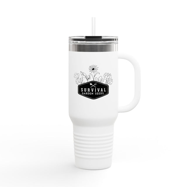 Stay hydrated on the go with this stylish and functional insulated travel mug featuring the Survival Garden Seeds logo with flowers. This 40oz mug is perfect for outdoor enthusiasts, gardeners, and nature lovers. It's ideal for long trips, hikes, and camping adventures. Whether you prefer hot coffee or cold iced tea, this double-wall insulated mug will keep your drinks at the perfect temperature for hours.