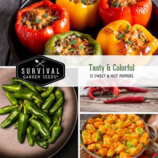 Survival Garden Seeds 12-Pack Pepper Collection offers a complete variety of heirloom sweet and hot peppers, selected for diverse flavors, growing success, and long-term food production. Perfect for gardeners seeking a colorful, productive mix for cooking, preserving, or fresh eating.