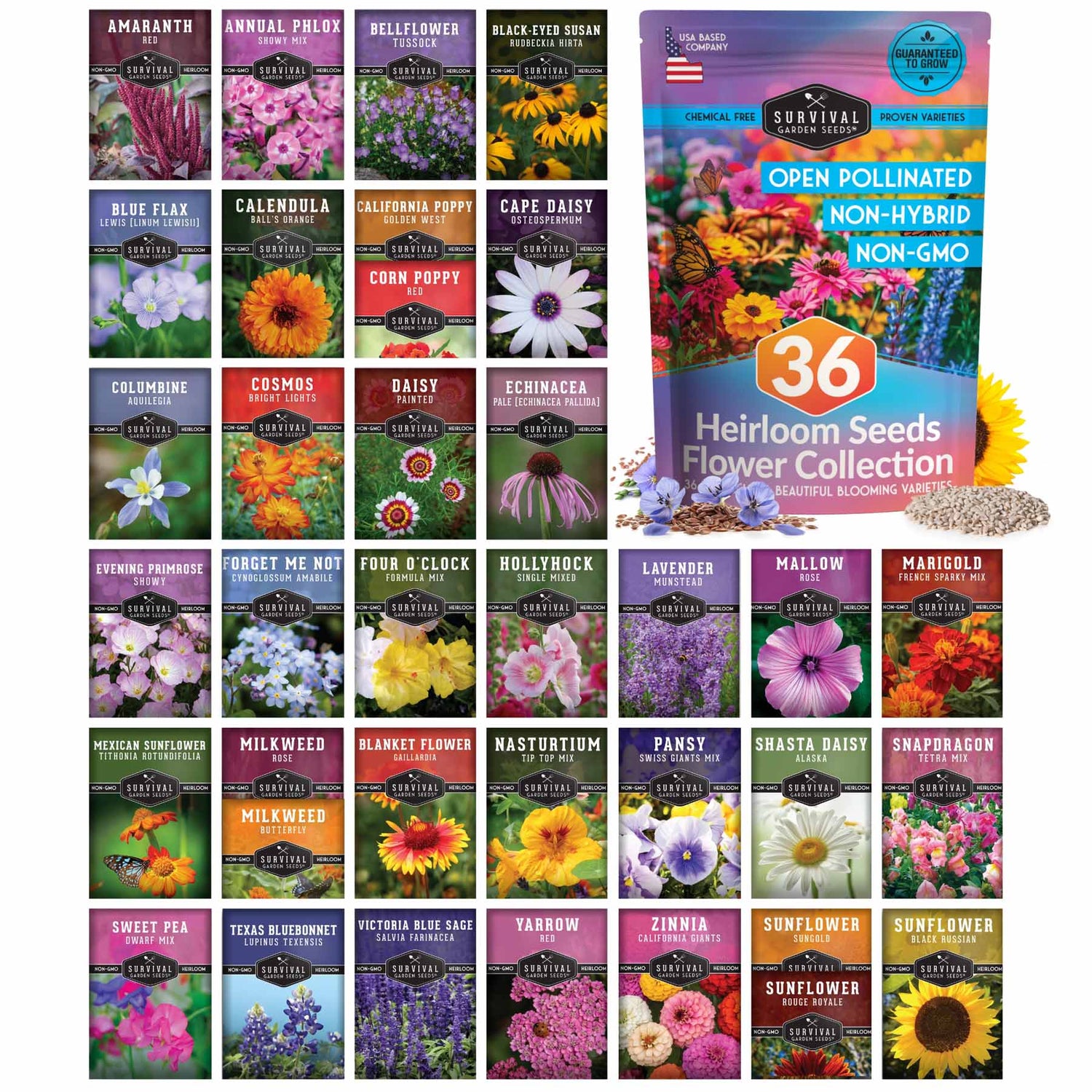 - 36 Flower Seed Varieties including annuals, perennials, and wildflowers selected for pollinator support, companion planting, and continuous seasonal color